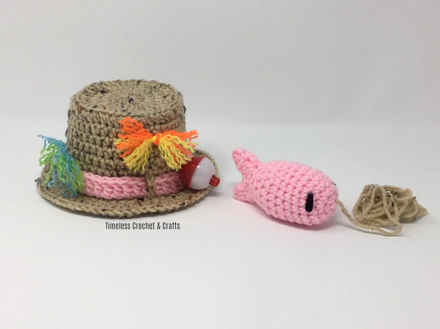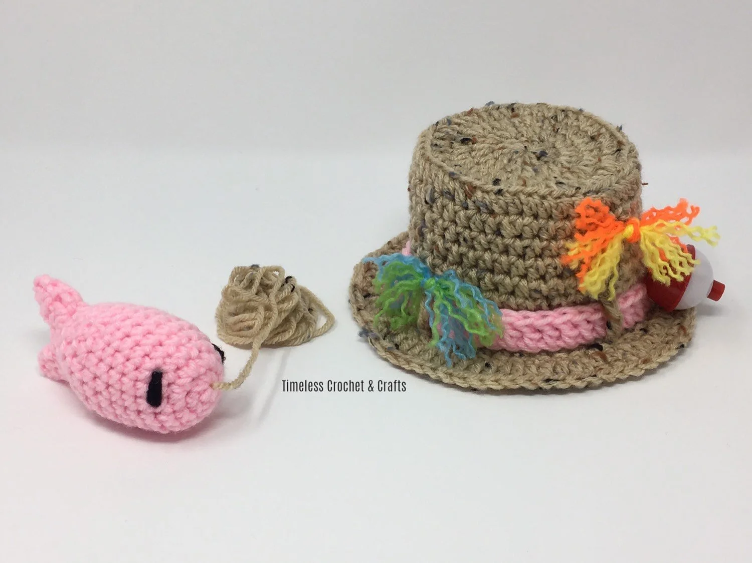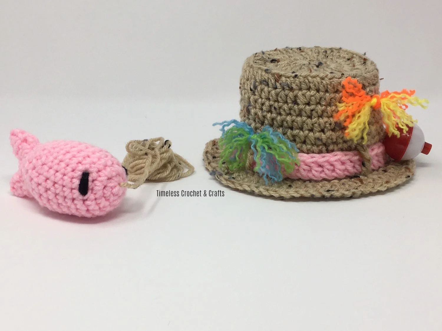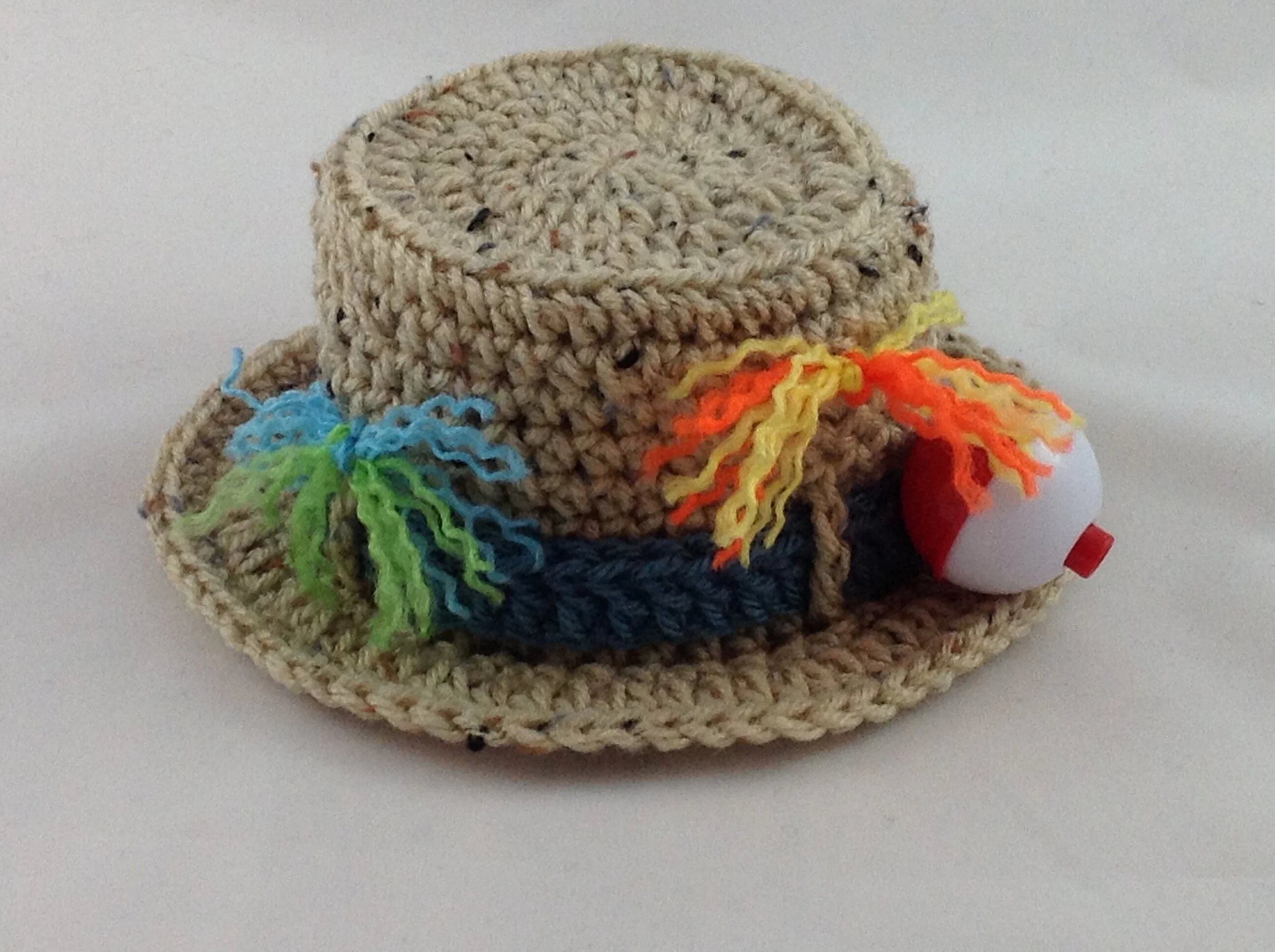 This listing is for ONE FISHING HAT. Fishing hat features "yarn lures" and fishing bobber. Bobber is removable.