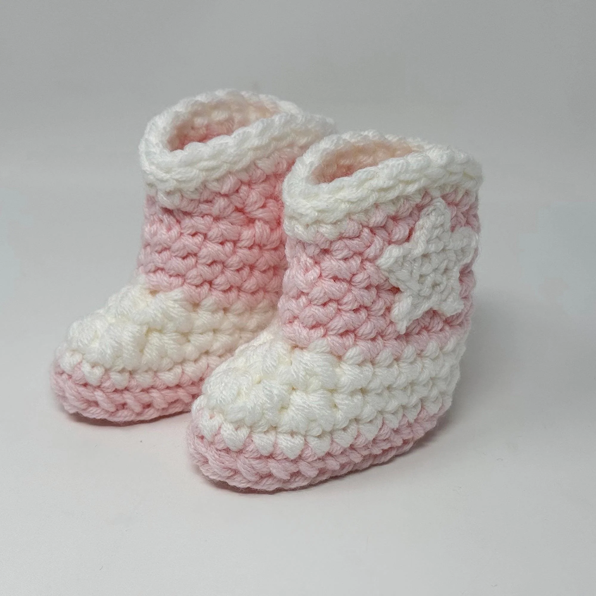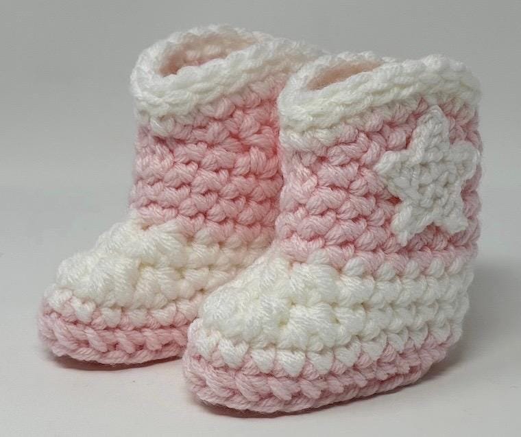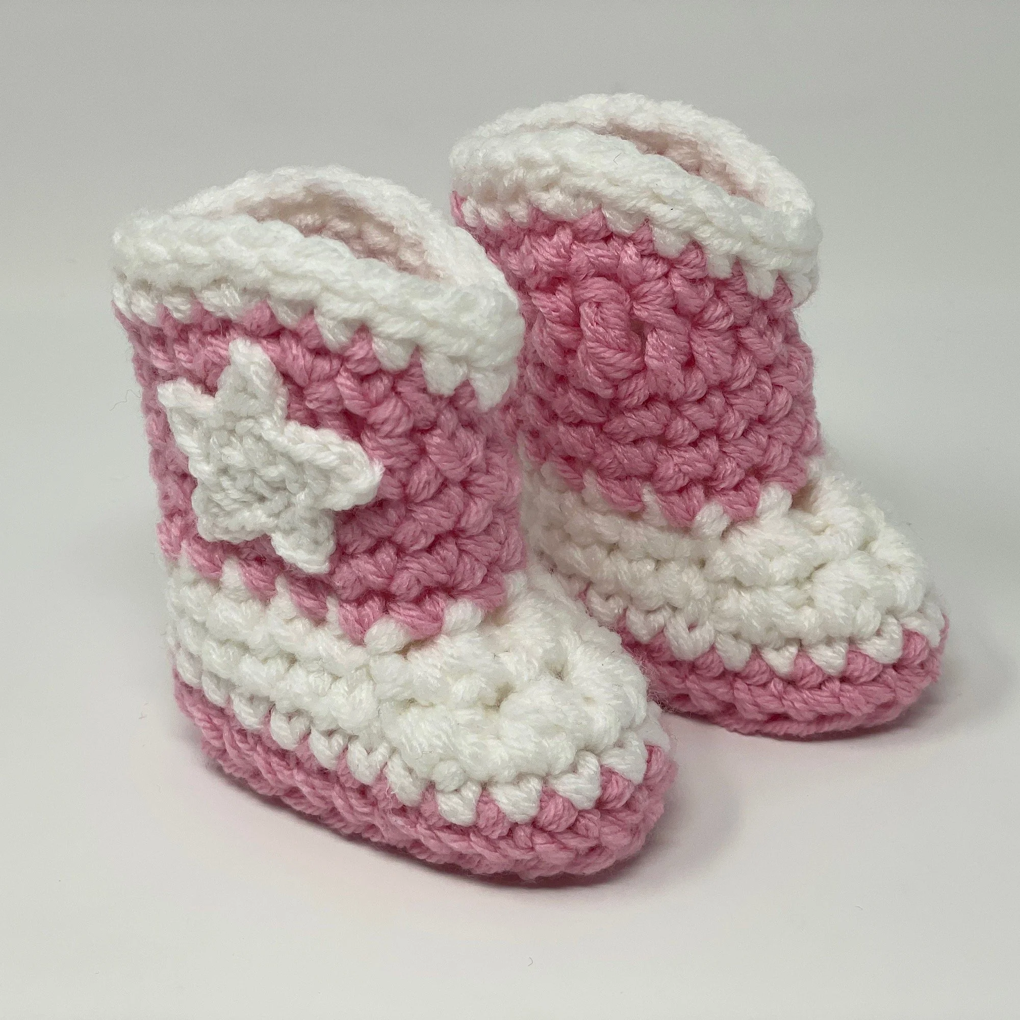 These MADE TO ORDER baby cowgirl boots are made with acrylic yarn in pink and white. I can make them with or without the star on one side of each boot, just choose your option at checkout. They would make a great photography prop, cowgirl baby shower gift or gender reveal baby announcement!